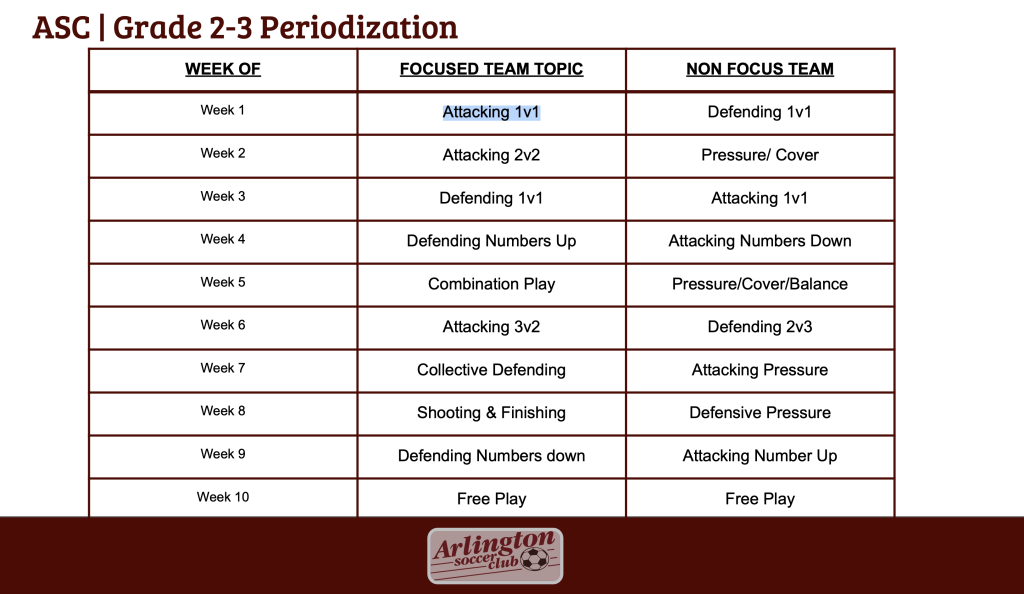 Session 2 only applies to select teams in grade 3, for all other teams in grade 2 and grade 3 that are in-town please follow the session plan 1 only. This follows the seasonal periodization for your age group. However please bear in mind the theme that comes under the Non Focus Team label, as this will bring out the desired behavior for your main topic labeled Focus Team in the periodization grid. .